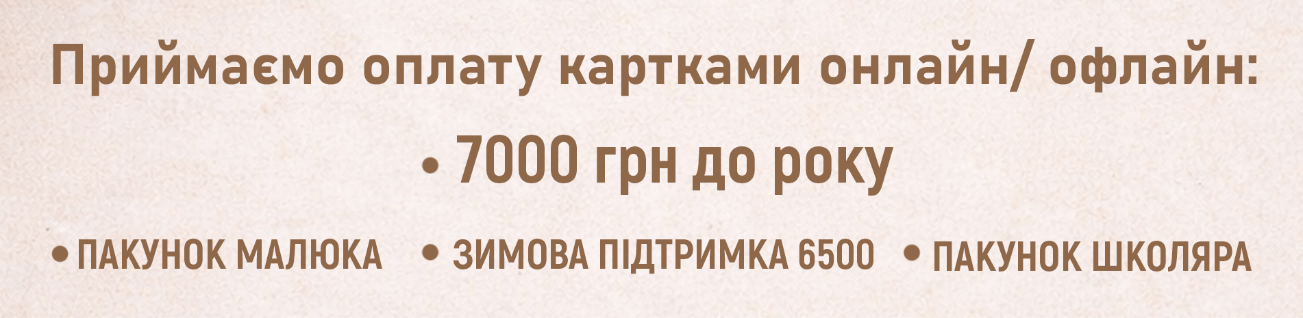 Усі наші товари можна оплатити картками: 7000 до року, Пакунок малюка, Зимова підтримка 6500, Пакунок школяра, є-малятко,